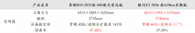 吉利银河 E5:车身尺寸 4615×1901×1670mm,轴距 2750mm,纸面数据优势明显,但溜背造型压缩了后排头部空间,身高 180cm 乘客易顶头,后备厢常规 461L,放倒后 1877L,虽容积较大但地台偏高,得房率仅为67.2%,搬运婴儿车等大件物品不便,且缺乏灵活拓展设计,实用性打折扣。不过得益于神盾电池的紧凑布局,车内基础乘坐空间与零跑 B10 基本持平。