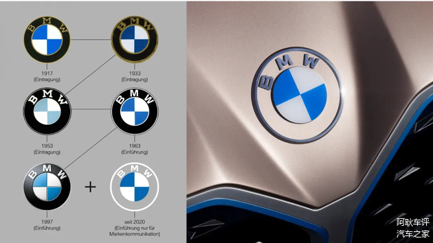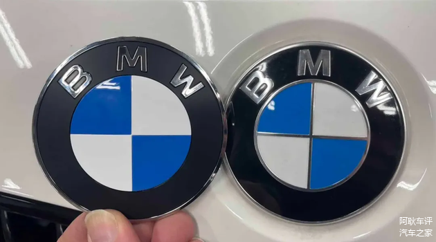 宝马新旧车标的差异主要体现在四个细节上,新标识取消了内圈镀铬圆环以及蓝白图案外围的镀铬描边。传统亮面黑色外圈被替换为缎面哑光质感,呈现细腻的磨砂肌理。蓝白色块的饱和度得到提升,使蓝色更鲜艳、白色更通透。