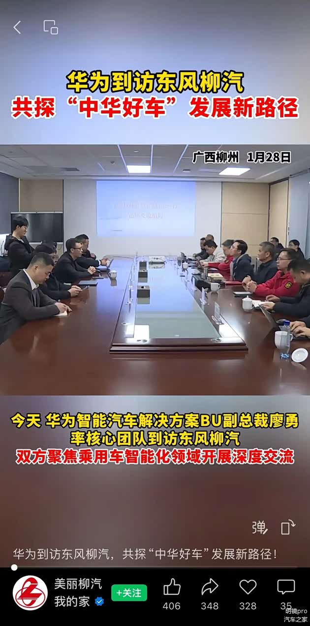 1月28日,东风柳汽官方发布了一则视频。该视频显示华为智能车解决方案BU副总裁廖勇率核心团队到访东风柳汽。在视频中,官方还披露了双方聚焦乘用车智能化领域展开深度交流。经过深入研讨,双方在乘用车重点规划车型加速推进智能化解决方案的适配与落地,后续合作推进路径形成初步规划等方面达成多项共识。未来,双方将按既定规划稳定推进各项工作,持续整合双方优势资源,共同为中国汽车产业新能源转型升级注入动能。