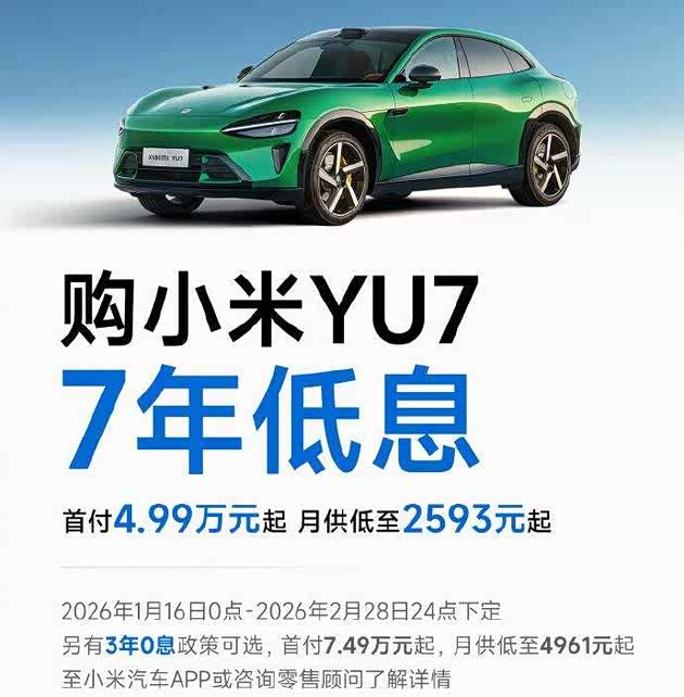 一月中旬,雷军在一场直播中透露, 小米YU7也将推出7年贷款政策,首付款直接来到了4.99万。