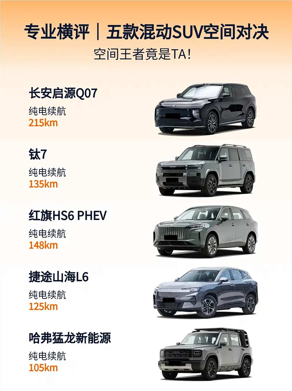 一句话总结:要空间选Q07,要越野选猛龙,商务选红旗,预算紧选捷途!
