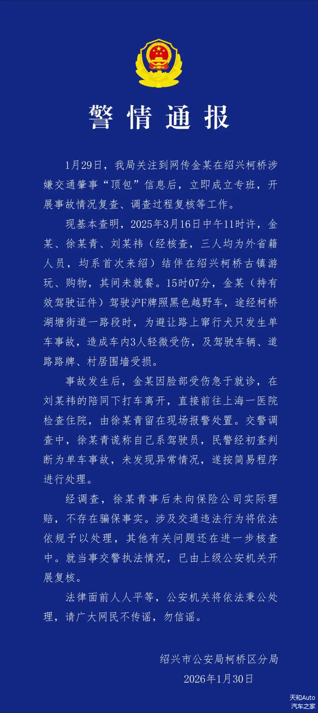 网传的演员金晨涉嫌“肇事逃逸和事故骗保”事件已有官方回应,绍兴市公安局柯桥区分局发布了警情通报。