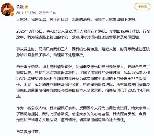 从通报内容可以确认金晨没有交通事故骗保的情况,金晨也发文道歉回应,称其在事故发生之后因伤势较重,被经纪人第一时间带去医院急诊并进行手术;术后得知其助理向交警说明自己是驾驶人并配合完成事故认定,其认为作为实际驾驶人必须承担全部事故责任,并为事故出现的不当处理承担全部责任。于是,金晨让助理联系保险公司撤销保险理赔,所有损失由其个人承担,并且相关赔付已于2025年4月完成。