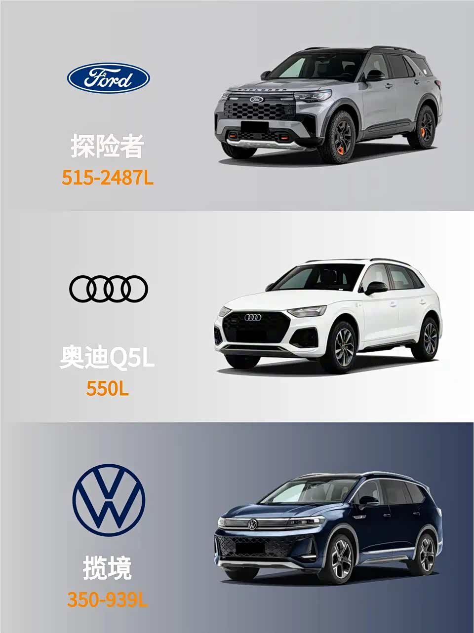 探险者后备箱2487L放倒秒变房车,Q5L的550L塞个帐篷就满,揽境三排启用后只剩350L。老公看着我把烧烤架+充气床+狗笼全装进去,终于闭嘴了😏