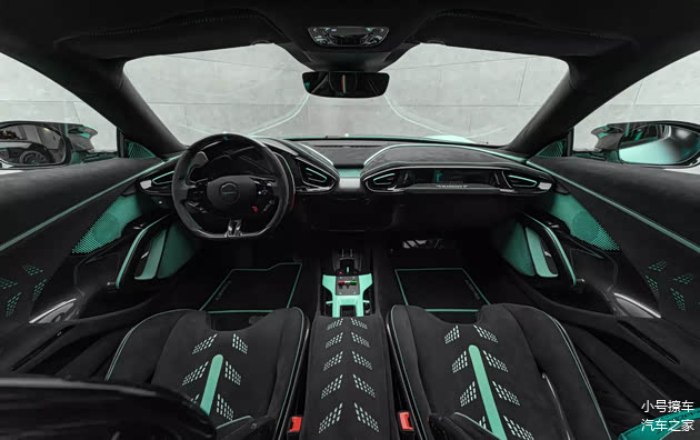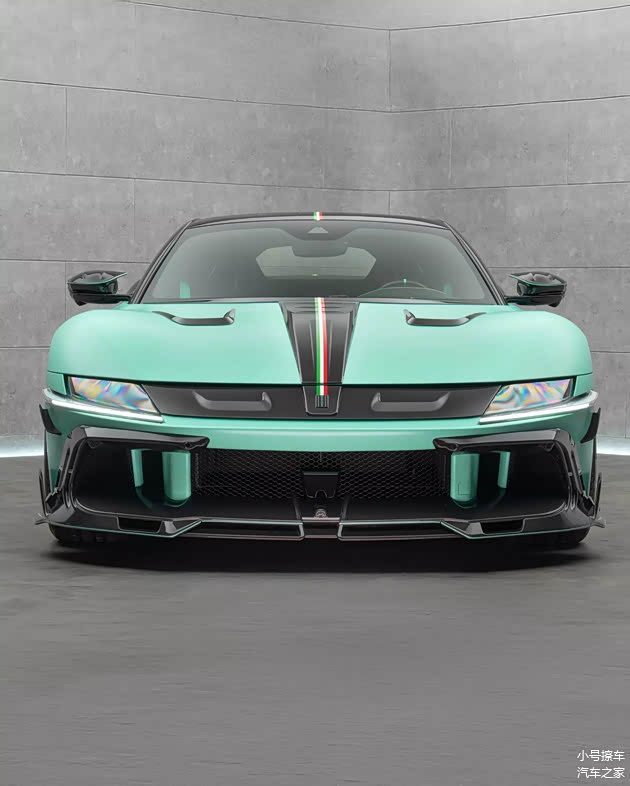 侧面造型方面,车身采用了绿黑渐变色设计,车身覆盖件大面积使用了碳纤维材质,能够起到降低车重的目的;前后翼子板位置都有导流槽,侧裙部分还配备有空气动力学套件,风格更显夸张;前轮毂尺寸为21英寸,后轮毂尺寸则是22英寸,搭配有大尺寸碳陶瓷刹车盘以及车身同色卡钳。