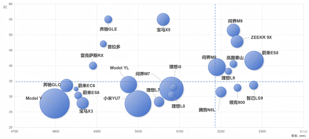 35万以下市场则是大五座SUV的天下,核心逻辑围绕“空间最大化”与“豪华平权”展开。这一区间的产品车长大多短于5100mm,其中5000mm以下的车型是绝对主流,通过优化空间设计,实现二排乘坐空间与行李箱容积的双重提升,同时将豪华配置、智能系统拉满,精准冲击着传统豪华中型SUV的市场份额。