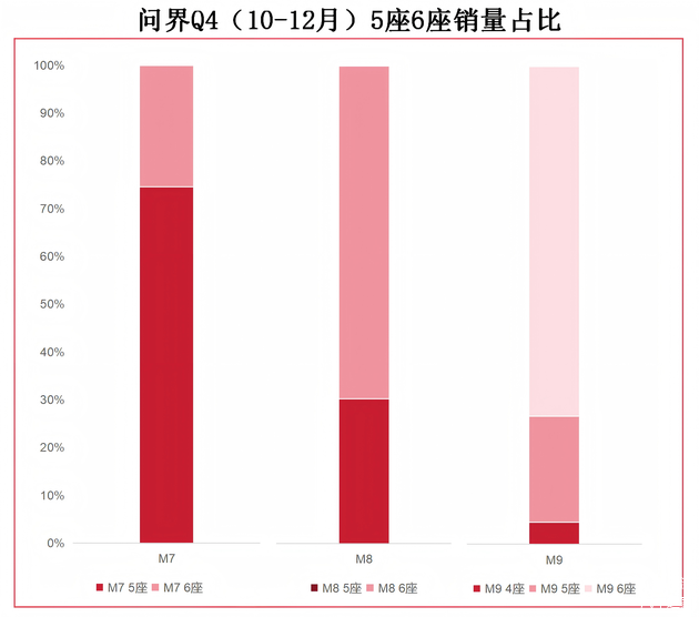 定位35万以下市场的问界M7,车长5080mm,以大五座版本为绝对主力,数据显示其五座版销量占比超七成,即便提供六座选项,也难以撼动五座版本的主导地位。而定价35万以上的问界M8,车长提升至5190mm,六座版成为主销车型,销量占比同样高达七成,成为品牌高端化的核心支柱。这种“价格决定座位布局偏好”的现象,并非问界独有,而是全行业的共性规律,也为其他品牌的产品规划提供了参考范本。