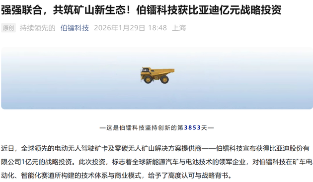 值得注意的是,就在昨天,伯镭科技宣布获得了比亚迪股份有限公司1亿元的战略投资,双方有望在技术研发、供应链优化及特定场景产品探索等方面展开深度合作。