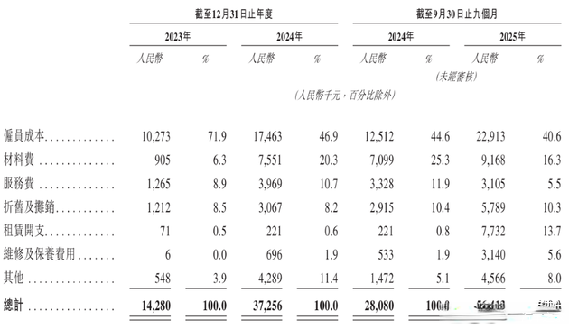 2025年前9个月,伯镭科技的研发开支为人民币0.56亿元,较2024年同期的0.28亿元同比增加100.9%,伯镭科技表示主要由于研发团队人数增加及研发项目的设备租赁。