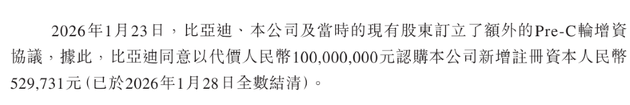同时值得注意的是,2026年1月23日,比亚迪、伯镭科技及当时的现有股东订立了额外的Pre-C轮增资协议,伯镭科技获比亚迪1亿元战略投资。