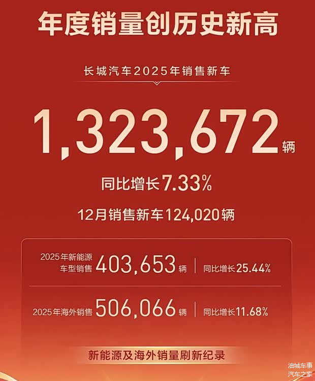 从整体销售表现来看,长城汽车2025年累计销售新车132.37万辆,同比增长7.33%。其中,新能源车型的销量贡献了40.37万辆,同比增长幅度为25.44%,这一领域的增长势头较为明显。海外市场的拓展也继续取得进展,全年海外销售量为50.61万辆,同比增长11.68%。
