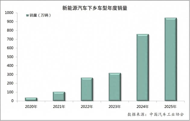 拉动新能源汽车市场实现快速增长,是下乡活动取得的最直观成效。中国汽车工业协会统计数据显示,2020年至2025年,新能源汽车下乡车型年度销量从39.7万辆一路飙升至943.1万辆,年均增速远超行业平均水平,其在全国新能源汽车总销量中的占比也在持续攀升。