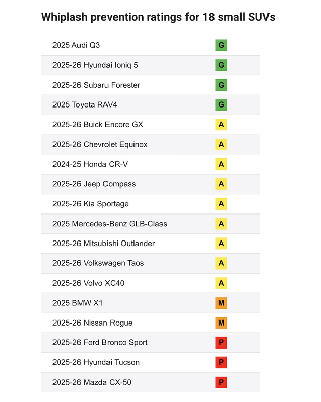 美国公路安全保险协会推出最新座椅与头枕评估,以了解追撞事故造成的颈部损伤,首批接受测试的 18 款 SUV 中,仅有 4 款获得 GOOD评级。