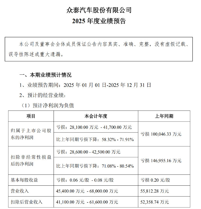 众泰汽车发布2025年业绩预告,亏损的金额竟然比某些新势力低很多?预亏2.81亿元-4.17亿元,较去年亏损10亿元已有大幅收缩。