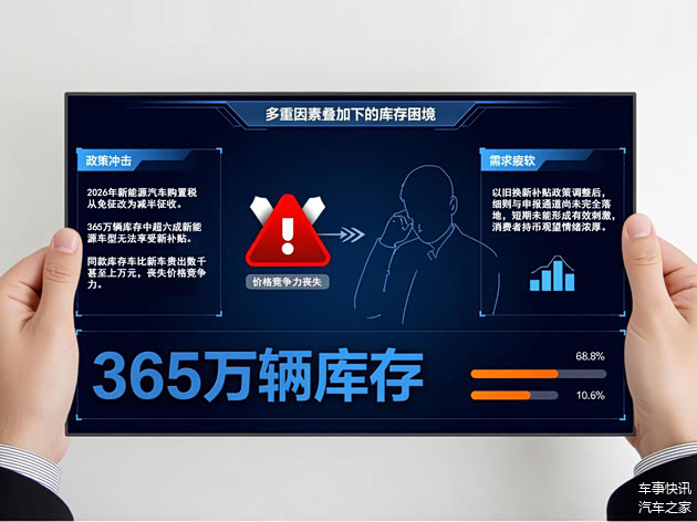 多重因素叠加,导致1月库存压力居高不下。首先是政策切换的冲击,2026年新能源汽车购置税从免征改为减半征收,365万辆库存中超六成新能源车型无法享受新补贴,同款库存车比新车贵出数千甚至上万元,丧失价格竞争力;同时,以旧换新补贴政策调整后,细则与申报通道尚未完全落地,短期未能形成有效刺激,消费者持币观望情绪浓厚。数据显示,68.8%的经销商反馈客流、订单量同比下滑,仅10.6%认为市场呈回暖趋势,终端需求疲软直接加剧库存积压。