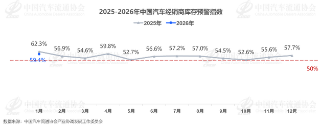 1月31日,中国汽车流通协会发布核心数据:2026年1月中国汽车经销商库存预警指数达59.4%,虽同比下降2.9个百分点,但环比上升1.7个百分点,持续处于50%荣枯线之上,意味着国内汽车流通行业仍深陷不景气区间,经销商面临多重经营压力,车市开年便迎来库存大考。