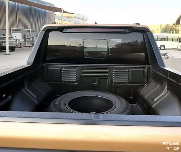 车尾部分,环形熏黑盖板中,巧妙融入了C字型尾灯,并在同样粗壮的后保杠内,加入了方便进出后斗的凹槽,使其可以最大限度地呼应前脸的前卫性与硬朗画风。此外,与常规皮卡不同的是,其后斗内并未采用平铺结构;而是使用了内凹设计,并在内部置入备胎。