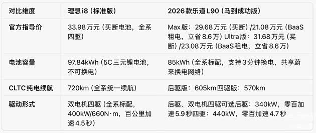 价格方面的因素肯定有,理想i8是卖33.98万,价格比29.68万起售的2026款乐道L90略贵的,而且不能换电,BaaS方案下,2026款乐道L90的售价来到了20.18万起,甚至和理想i8完全不是一个价位区间了。但是理想i8贵也有贵的道理,例如电池容量更大,续航更长,而且标配四驱。但这些优势能够弥补巨大的价格差距吗?我们接着往下看。