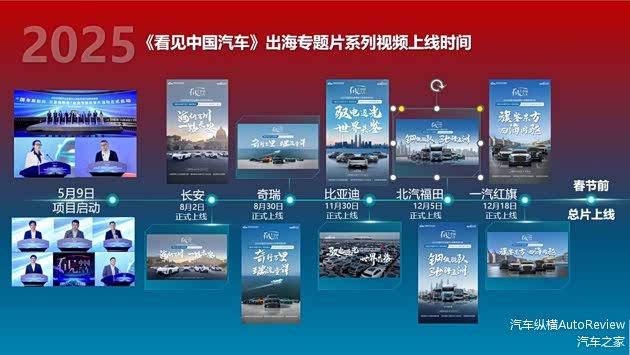 紧扣中国汽车扬帆出海的主旋律,中国汽车工业协会与央视网联合推出“2025中国汽车品牌向上发展专项行动特别策划—— ‘国车新航向 万里拓新章’出海专题纪录片活动”,通过5个代表品牌的出海故事,描绘出中国汽车走向世界的宏大画卷,展示中国汽车在全球产业发展中的重要作用,提升“中国汽车”在全球舞台上的形象和影响力。此项活动于2025年5月9日中国品牌日到来之际在北京汽车博物馆正式启动。从2025年8月到12月,长安、奇瑞、比亚迪、北汽福田、一汽红旗等5部品牌独立专题片陆续上线。