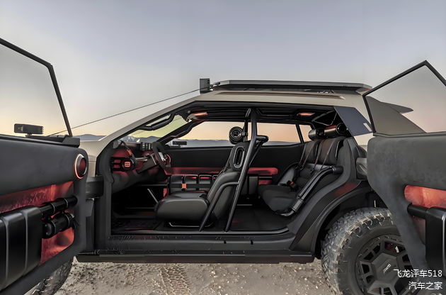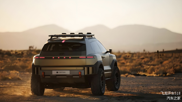 来到车身侧面,下一代现代KONA采用了造型更加激进的方盒子越野车轮廓,车顶配备了全尺寸多功能行李架,正前方配备了四个射灯,还支持更多的扩展应用,实用性拉满。车身采用了大量肌肉线条勾勒,棱角分明。外扩式的轮眉下方配备了18英寸的轮圈,并匹配了越野车专用的AT轮胎。车身侧裙采用了双色设计,两侧配备了电子后视镜,并配备了对开式的车门设计,雕塑感的车身造型,更简洁的轮廓。让该车看上去更像是一台登月车。