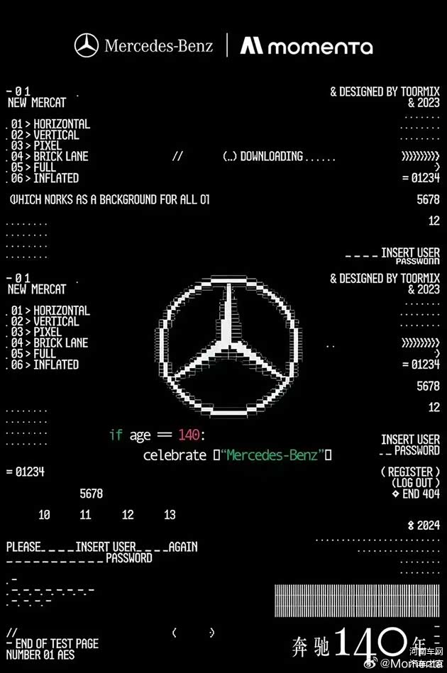 文案:(代码像素奔驰标+if语句庆生)140年创新,共筑智能出行