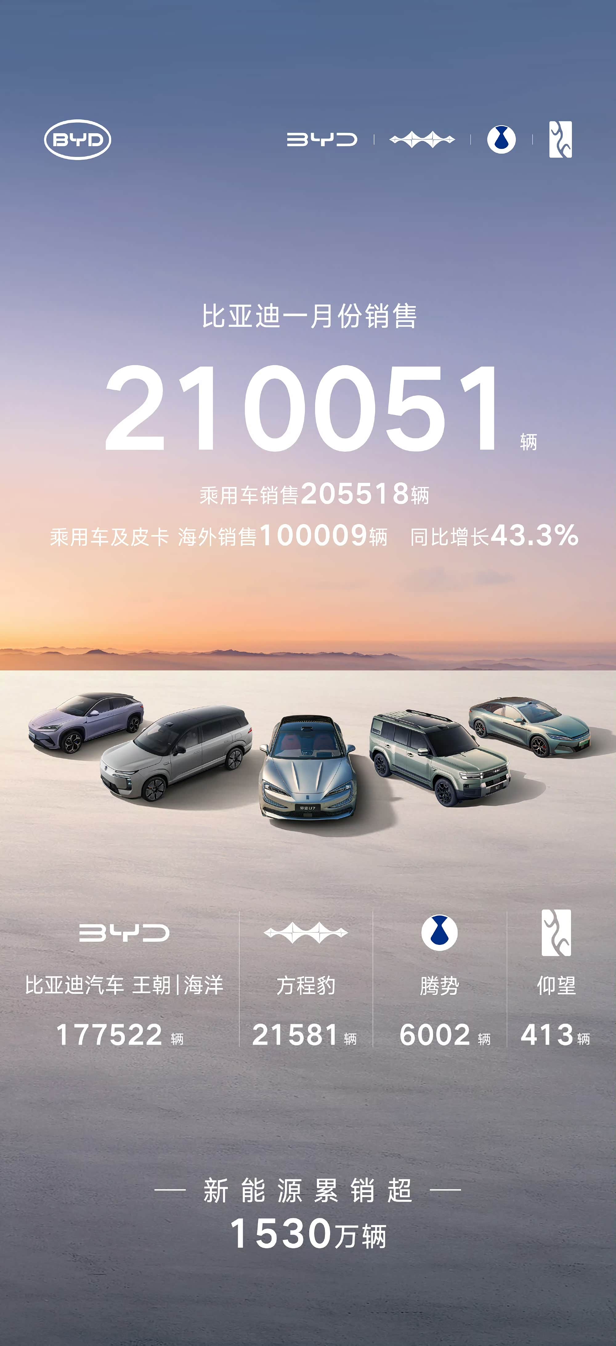 比亚迪同比下滑29.13%,2026年1月销量部分统计