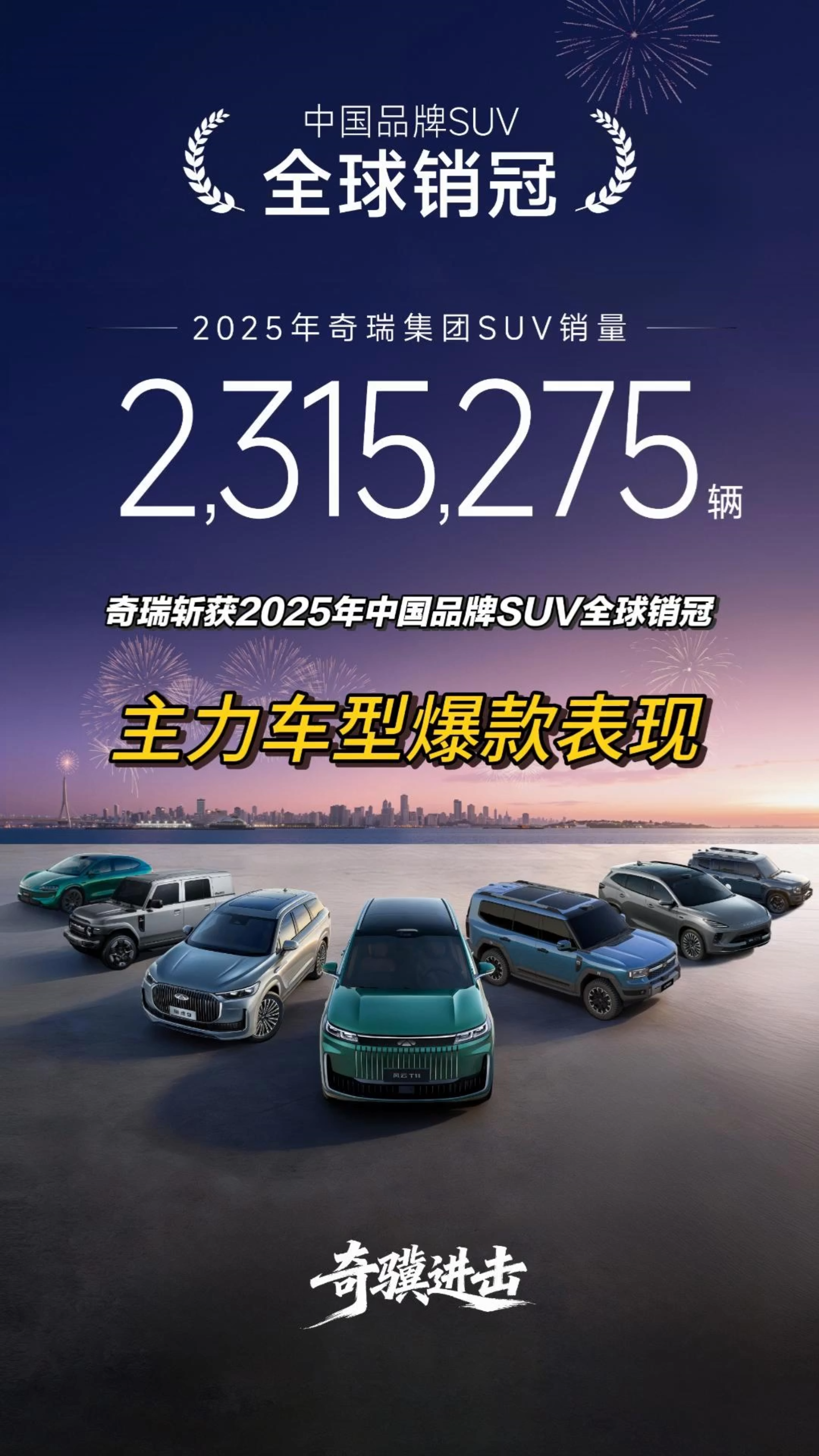 奇瑞斩获2025年中国品牌SUV全球销冠,主力车型爆款表现
