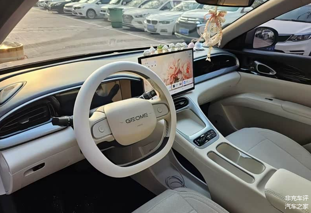 方向盘也改了,换成了平底设计,中间嵌的是吉利银河的标。这招挺高明,把这台入门小车的心理档次往上拉了一截,至少坐在驾驶位上,视觉感受没那么廉价。