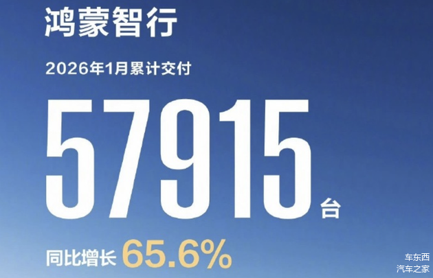 鸿蒙智行2026年1月交付5.79万台,同比增长65.6%,相较2025年12月的8.96万台环比下降35.3%。