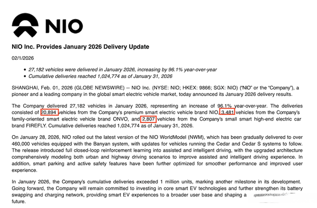 蔚来集团公布乐道、firefly萤火虫1月销量
