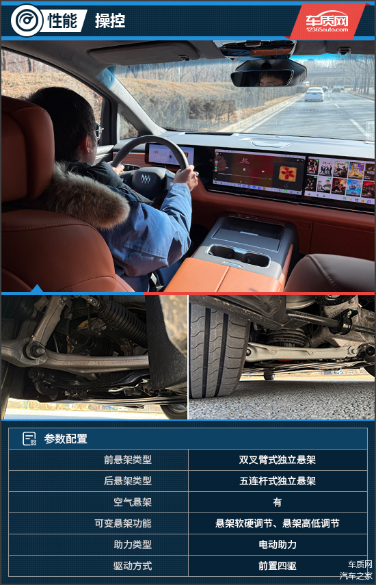 评测车采用前双叉臂式独立悬架+后五连杆式独立悬架的组合,配有预瞄式魔毯底盘,可提前20米感知路面起伏,并对悬架阻尼进行毫秒级实时调节,高效过滤路面颠簸,显著提升行驶的平稳性与高级质感。