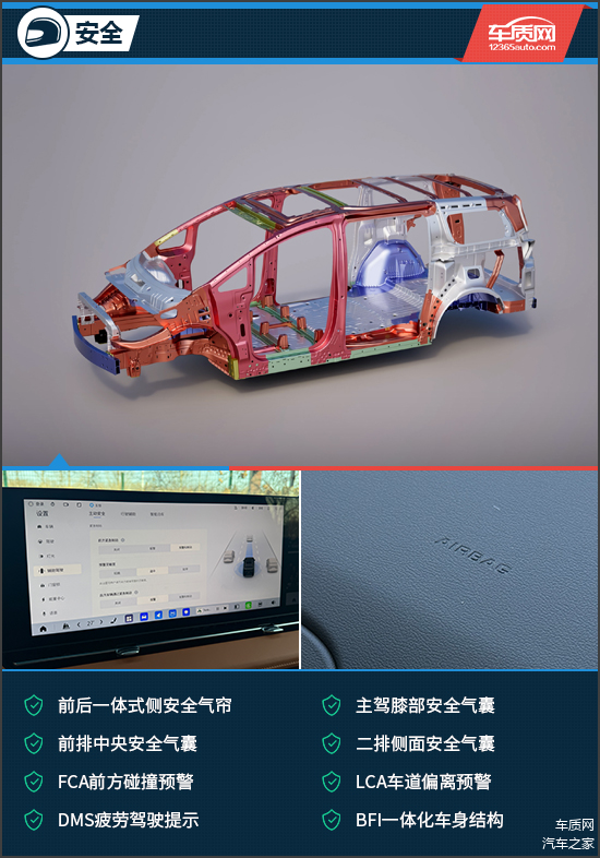 安全配置方面,评测车提供了丰富的主动和被动安全配置,除了常规功能之外,还提供了同级别罕见的主驾膝部安全气囊和前排中央安全气囊,能够为日常行驶提供全方位的安全防护。