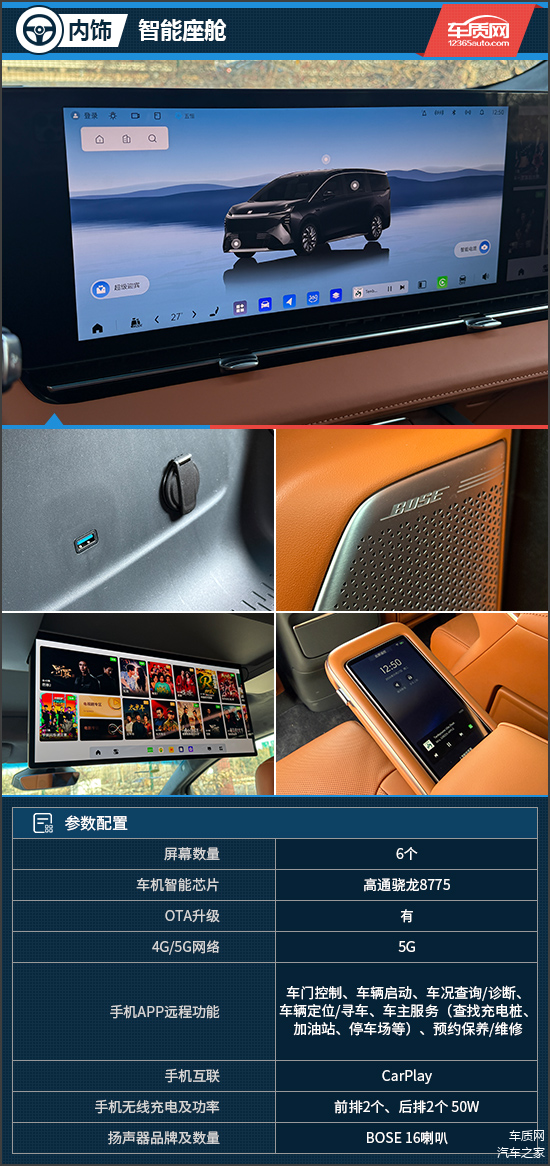智能座舱方面,评测车搭载高通骁龙8775芯片,并融合文心一言、DeepSeek R1、豆包等多模态AI语音助手,可从容应对导航、信息查询、内容创作等全场景交互需求。第二排扶手前端嵌入5.5英寸智慧移动管家屏,支持取下手持操作,轻松操作空调、多媒体及座椅功能。此外,后排更配备21英寸4K超清智慧屏,不仅画质细腻,更支持商务演示、在线会议与多媒体娱乐,延展了后舱使用场景。