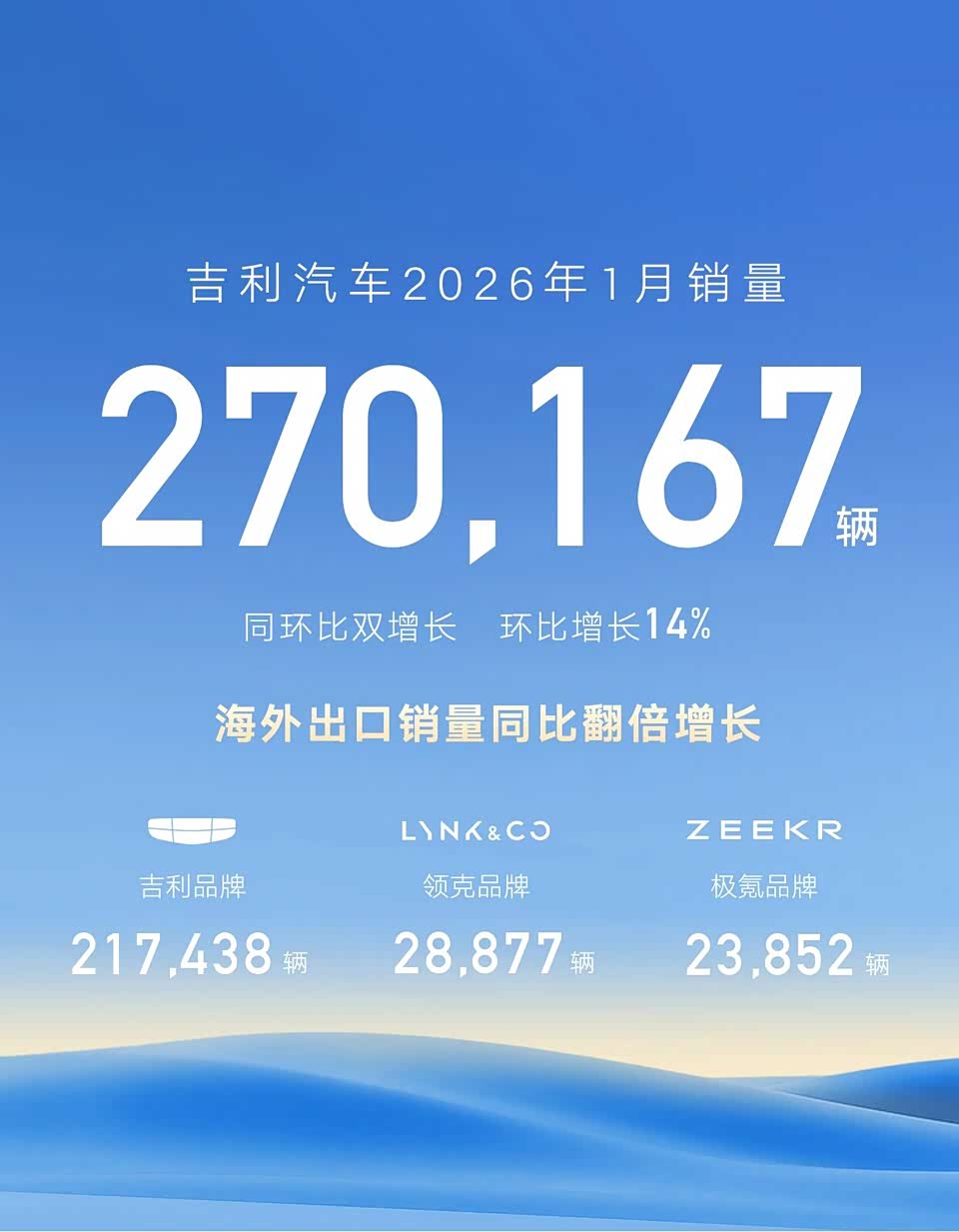 吉利喜迎开门红,1月销量270167辆!新能源板块当月销量达124252辆,集团电动化转型已取得实质性成果。 吉利品牌1月销量为217438辆,领克和极氪品牌销量分别为28877辆和23852辆。
