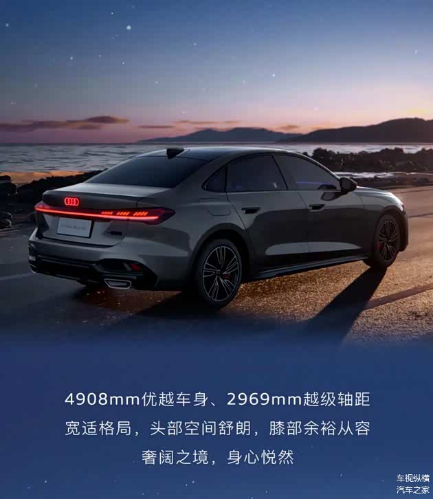 外观上还是奥迪A5L经典的溜背造型,线条流畅,车身尺寸4908×1860×1458mm,轴距2969mm,后排空间不算局促。19英寸双色轮毂搭配红色卡钳,运动感很突出,7种车身配色也能满足不同人的审美偏好。