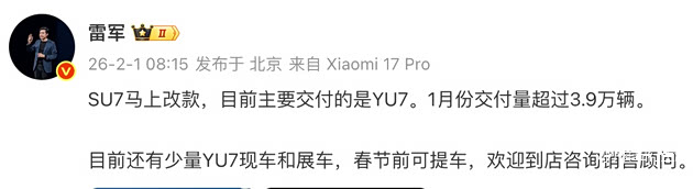 在一片关于产能瓶颈和交付延迟的行业质疑声中,小米汽车交出了一份令人意外的答卷:2026年1月交付量超39000台。当这个数字公之于众时,整个中国新能源汽车市场仿佛被投入了一颗深水炸弹。雷军随即在社交媒体上透露:“SU7马上改款,主要交付的是YU7。”这句看似平淡的宣告,背后却隐藏着小米造车之路的战略变奏与行业深处的时代回响。