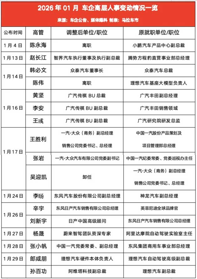 笔者依据车企公告、媒体爆料等信息,汇总整理了2026年开年这一个月时间里的车企高层人事变动案例。据我们不完全统计,有10余家车企发生了高层人事变动,涉及高管近20人。具体情况见下表: