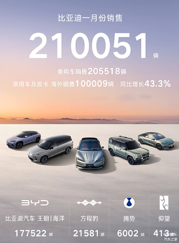 首先是比亚迪汽车,比亚迪汽车今年1月的总销量为210051辆,看似销量情况非常出色,但是国内的销量情况却相对一般,因为海外版的销量达到了100009辆,海外同比增长了43.3%,销量大涨,但是国内的销量却只有10万出头。很明显,购置税补贴的滑坡对于比亚迪的冲击还是比较明显的。值得一提的是,今年1月份方程豹系列一共只卖出去21581辆。要知道去年12月份仅一款方程豹 钛7的销量就超过了3万辆。所以说比亚迪出海的策略是无比正确的,总销量还算是不错,而且我们不用太担心比亚迪的销量,预计今年3月份就会开始回暖,因为比亚迪长续航的电车已经上市了!