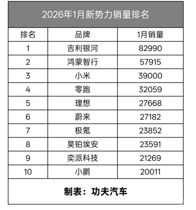 有人说,2026年1月新势力销量呈现的特点是“普跌”,却依然有车企交出了完美的答卷。它们不是名声在外的蔚小理,而是银河、极氪、奕派、昊铂埃安BU这几家。看来市场还是那样,唯一不变的就是不停在变,这几家不断整合的企业,都展示了更强的竞争力。