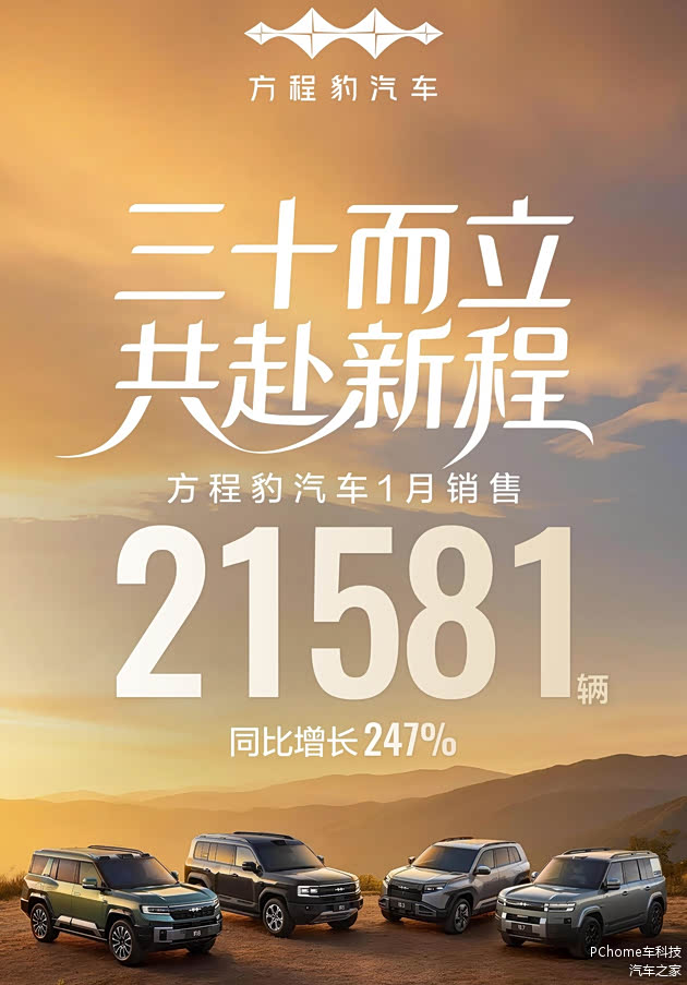2月2日消息,方程豹汽车官方微博今日发文宣布,方程豹汽车1月累计销售21581辆,同比增长247%;品牌累计销售318318辆,品牌成交均价23.4万元。
