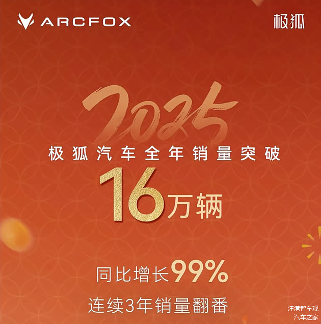 2025年全年,极狐品牌销量突破16万辆,连续3年实现销量翻番(2023-2025年),其中12月份单月销量更是突破2.4万辆,同比增长103%,这已经是极狐品牌连续3个月月销2万辆以上。
