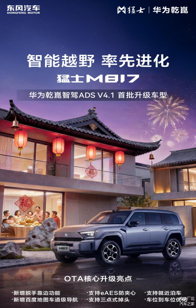 1月30日,猛士汽车正式开启官方OTA升级,猛士M817成为华为乾崑智驾ADS V4.1首批全量推送车型。凭借智能辅助驾驶功能的焕新与优化,既精准解决了用户多元场景下的用车痛点,为新春返乡之旅送上更聪明、更安全、更具温度的出行守护。