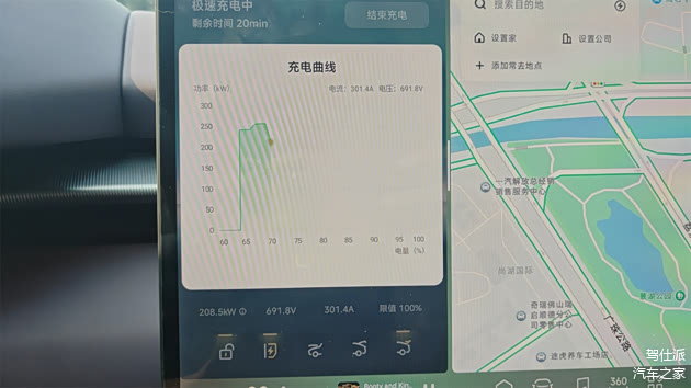 入门版本的75度磷酸铁锂电池,也同样具有5C超充能力。目前小鹏的自营站点里已经有了400kW超充桩。这次进行充电体验时受限于相对较高的起始SOC(约65%),但拉起的最高功率依然能够突破250kW,只不过到了70%后会有相对比较明显的功率下滑,但直到逼近90%时依然能有超过100kW的充电功率。最终实现了15分钟里补能超过200km的水平。