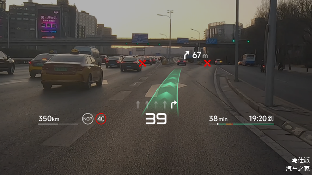 这套HUD和其它产品最大的区别,就在于它利用环境感知更准确的能力,做出了一条能直接“铺”在车道上的动态光带,就像赛车游戏里铺在车道上的发光轨道一般,指引效果比传统HUD直接投射平面图标的方式更好,而且光带的指引理论上和具体车道吻合,还能适应环岛指引这样的复杂路面。为了避免走错路,它甚至还会给其它车道打上红色的“X”,可见指引精确度之高。
