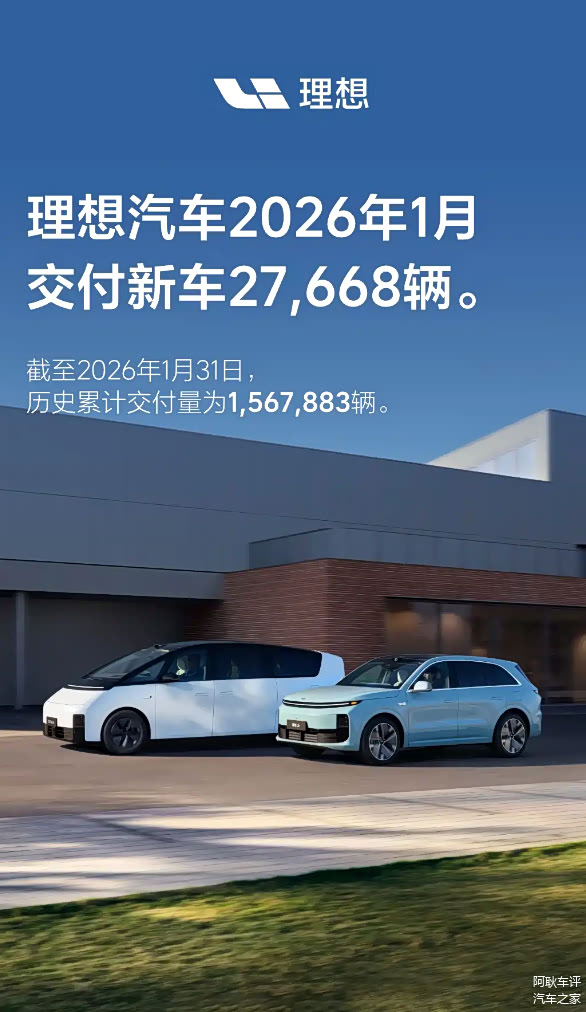 理想汽车1月交付新车27,668辆,同比增长7.55%,环比下降37.47%。截至1月31日,理想历史累计交付量达156.79万辆。