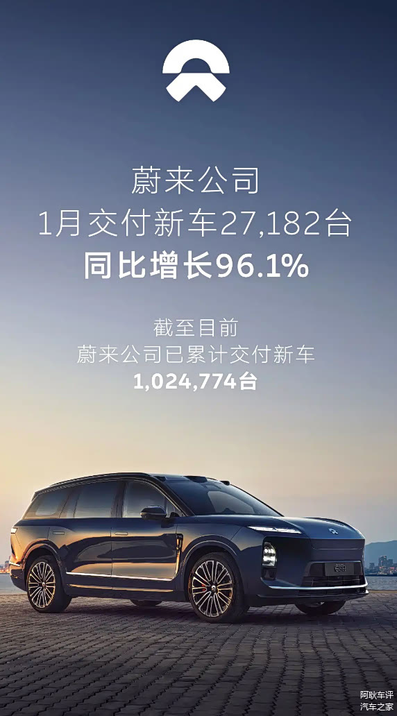 蔚来汽车1月交付新车27,182台,同比增长96.1%,环比下降43.5%。其中蔚来品牌高端智能电动汽车20,894辆,乐道品牌家庭智能电动汽车3,481辆,萤火虫品牌智能电动高端小车2,807辆。截至1月底,蔚来累计交付量突破102.48万辆。