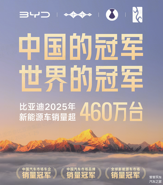2025年中国汽车市场年度销量数据近期公布,比亚迪以超过460万辆的全年销量,成为中国汽车市场销量最高的车企和品牌,同时也连续第四年位居全球新能源汽车销量榜首。