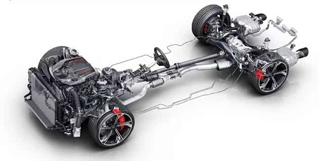 而为抵消插混系统增加的车重,奥迪基于PPE平台对底盘进行了专属优化,通过降低车身重心、升级悬挂系统与转向机构,最大限度保留了RS系列标志性的精准操控感。并且通过将电池组平铺于车身底部,混动版RS5的重心高度较燃油版降低了约25毫米,形成“低重心、宽轮距”的车身基础。这样也让增加的车重有了一个合理的解决方案。