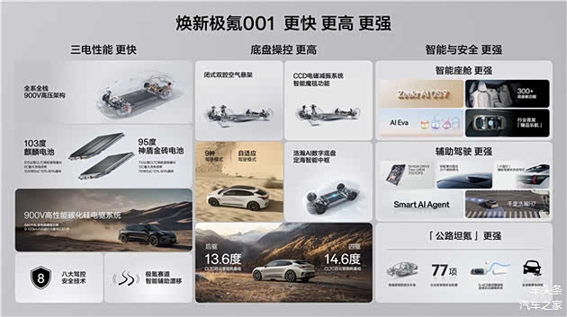 如果你认为焕新只是“小修小补”,那就大错特错了。焕新极氪001在核心三电与底盘技术上,建立了显著的代际优势。