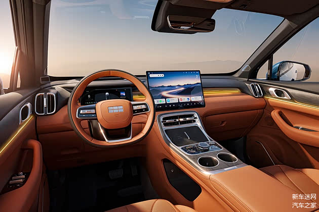银河 M7 的内饰设计与面向中国市场的燃油版博越 L 高度相似,但并非完全复刻。新车中控台配备了独立的全液晶仪表与中控多媒体屏,两侧空调出风口采用竖向布局,车门内饰板造型也与博越 L 保持一致。